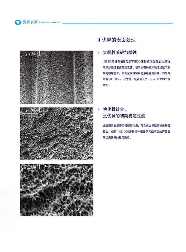 WEGO牙種植體所采用的大顆粒噴砂加酸蝕表面處理工藝,該表面在種植牙領(lǐng)域經(jīng)過了長期的臨床驗證。表面呈現(xiàn)蜂窩狀的多級孔洞形貌,均勻分布著20-60μm 尺寸的一級孔洞及2-6μm 尺寸的二級微孔。此表面具有顯著的骨誘導(dǎo)作用,可在愈合早期快速進行骨結(jié)合,使得WEGO 牙種植體相比于其他表面的產(chǎn)品表現(xiàn)出更優(yōu)異的初期穩(wěn)定性能。